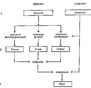 C'est sur la base de telles hypothèses que le Groupe µ fonde son Traité du signe visuel . Pour les auteurs, le système visuel produirait dans chacune de ses trois modalités fondamentales : spatialité, texture et chromatisme des structures de percepts élémentaires, intégrant et organisant les stimuli à partir de structures spécialisées : extracteurs de motifs, de directions, de contrastes, etc. On obtiendrait ainsi la production de figures (niveau 1) puis de formes (niveau 2) et enfin d'objets (niveau 3). Les figures naissent d'un processus d'équilibration entre les zones de cellules visuelles également stimulées. A ce premier niveau, naissent les notions de champ, de limite, de ligne, de contour, etc. Notre système perceptif, en produisant des différence, crée les conditons de constitution du sens. Au deuxième niveau, les formes font « intervenir la comparaison entre diverses occurences successives d'une figure et mobilise[ent] donc la mémoire. » . Le passage à l'objet interviendrait ensuite par l'adjonction de propriétés non visuelles provenant des autres modalités sensorielles au moment où la forme se doterait de caractéristiques permanentes. L'objet qui s'apparente à la notion de type est alors considéré comme fort proche de celle du signe : « De ce que les objets sont une somme de propriétés, douées de permanence et guidant l'action, on peut avancer que cette notion rejoint celle de signe. Le signe est en effet, par définition, une configuration stable dont le rôle pragmatique est de permettre des anticipations, des rappels ou des substitutions à partir de situations. Par ailleurs le signe a, comme on l'a rappelé, une fonction de renvoi qui n'est possible que moyennant l'élaboration d'un système. » . Le modèle du décodage visuel peut alors prendre la forme suivante :