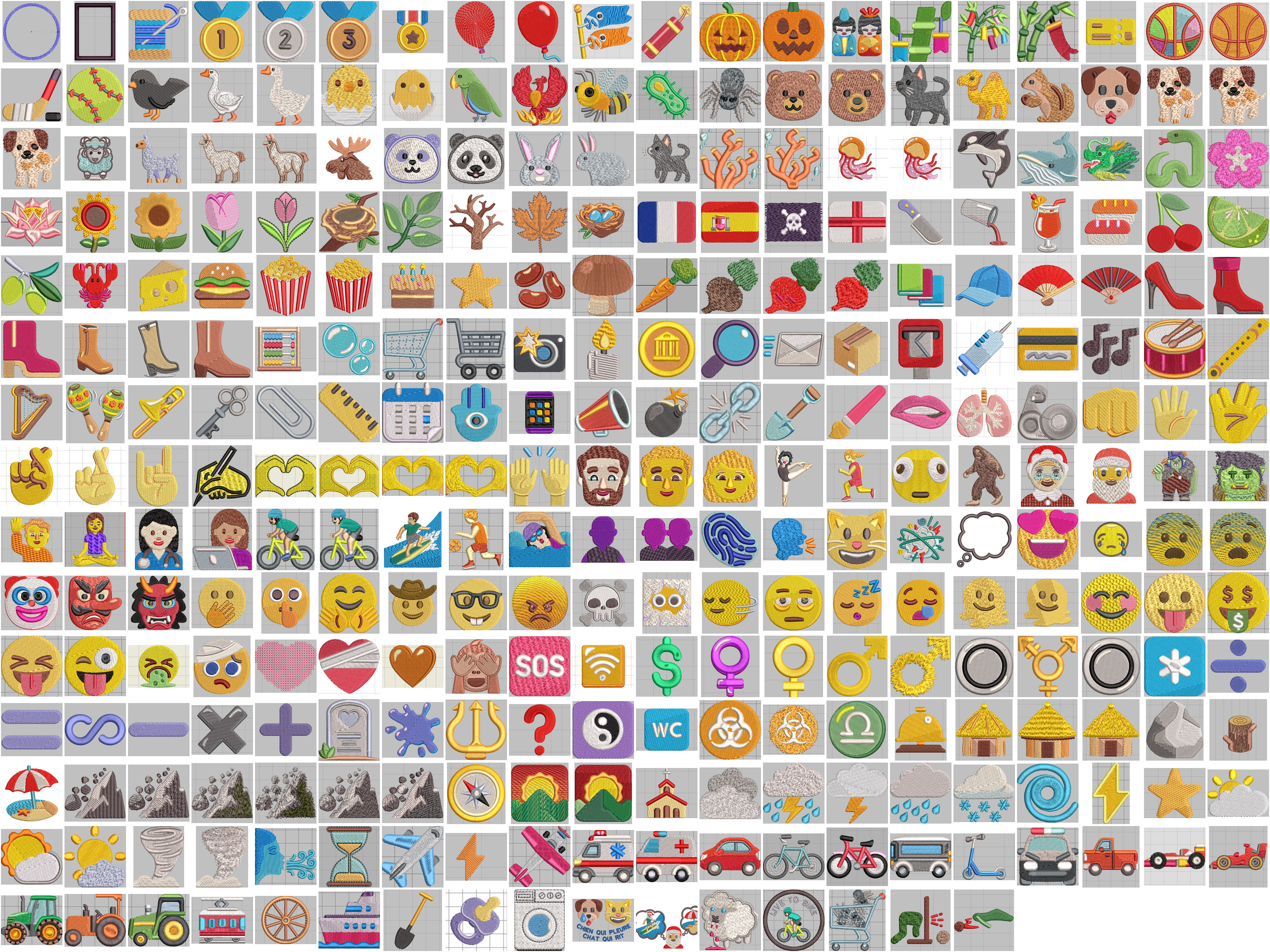 This folder contains embroidery emoji files in clipart, design and machine format. Most are indexed in the List of digitized emojis for embroiderytable. Read some explanations in Emoji Embroidery Project .