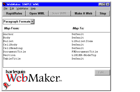 - Views of the WML file: The default view is Paragraph Formats. You can select other choices from the drop-down list: Character Formats, Format Overrides, and WML Libraries.