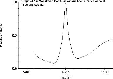 In this experiment, both to verify the theoretical calculations across the frequency spectrum, and to examine the differences in filter curves at different frequencies, three separate channels will be examined, 300Hz, 1000Hz, and 2500Hz. For each of these channels the frequencies of the component sine wave's are chosen to be equidistant about the CF of the channel. That is that whilst the frequencies move away from the filter CF the difference between them and the CF will always be equal. The tones change frequency up to a difference of 0.6 of the filter CF, the following graph shows the waveform envelope's peak amplitude. The modulation depth and IF remain constant for all readings, at 1 and 1000Hz respectively since the filter curve is symmetrical, making the tones equal in amplitude at all frequencies.