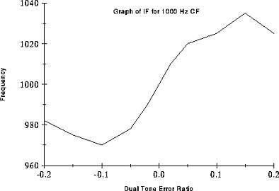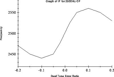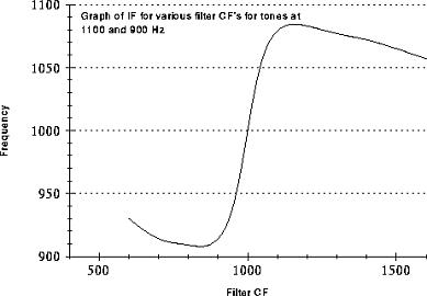 Looking at the graphs of Instantaneous Frequency (measured at peak amplitude) we see two seperate regions of IF change. In the region when the tone difference is within +/-0.1 of the CF the IF is pulled away from CF as the floating tone moves further away from the fixed tone. However, as the floating tone moves away from the CF it becomes attenuated (see filter curve) increasing the fixed tones dominance. Beyond the first region the floating tone's amplitude is reduced to such a level that the fixed tone starts to pull the IF back to the CF. Beyond the scope of the graph we would see the IF slowly return the frequency of the fixed tone as the energy of the floating tone reduces to zero.
