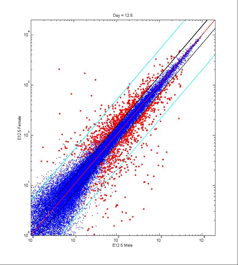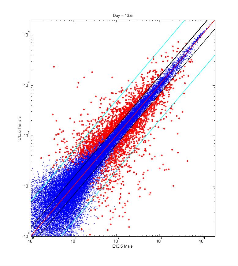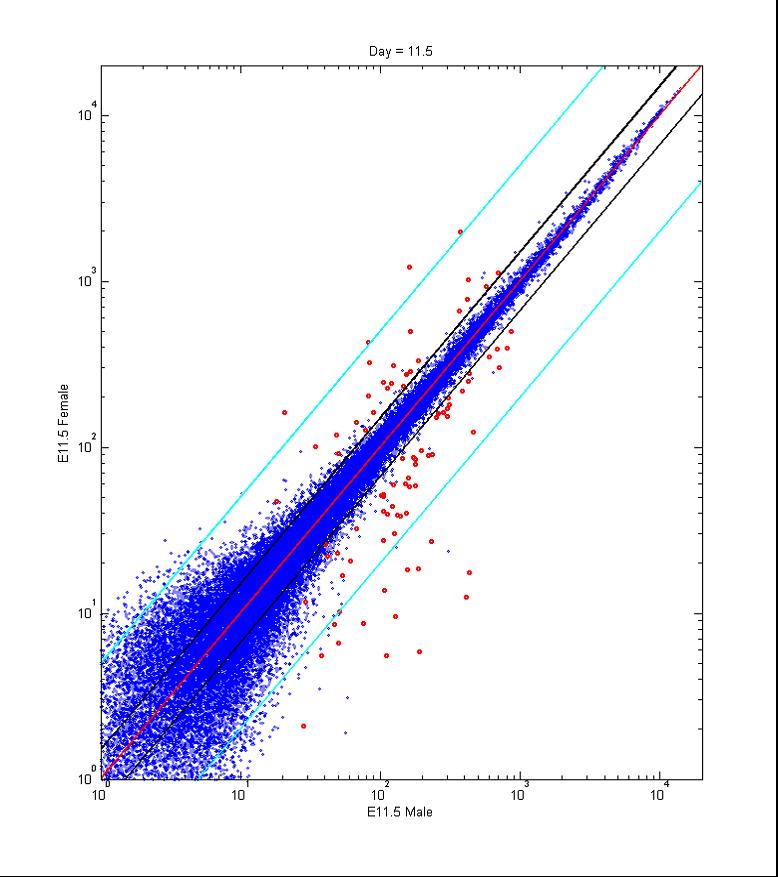 These scatterplots represent the systematic comparison of the log2-scaled expression signals from male and female somatic transcriptomes at E10.5, E11.0, E11.5, E12.5 and E13.5. Blue dots represent genes with expression levels statistically similar both in male and female gonads, while red dots represent genes whose expression profiles were found to be sexually dimorphic ( 1.5 fold change)