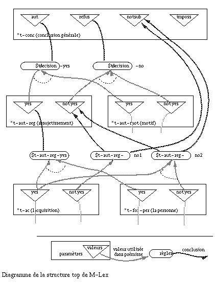 qui met en valeur la complexité relative que possède déjà ce petit bout de M-Lex. Grâce aux extraits du système et à l'arbre dans la Figure 5-12: "Diagramme de la structure "top" de M-Lex" [p. 204], on peut voir comment fonctionne un système expert. Son exécution est étroitement liée à l'état de sa base de données. Le système démarre en tentant de déterminer la valeur du paramètre *t-conc, pour cela, il commence par exécuter la première règle dans la liste, soit "$t-decision-yes". Il tente de trouver d'abord une valeur pour le paramètre *t-aut-reg, à savoir s'il y a assujettissement au régime de l'autorisation. S'il trouve une valeur, le prochain paramètre ("*t-aut-mot*") est tracé. Si ces deux valeurs ne sont pas "yes" avec un CF de 1, le système essayera d'autres règles comme "$t-decision-no". Dans ce cas, il ne faut pas retracer les paramètres de cette règle car cela a déjà été fait. Le cheminement vers la décision se constitue donc d'une façon assez dynamique en fonction des besoins et des points connus.