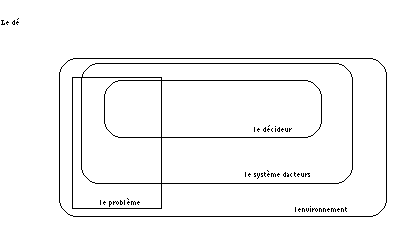 Dans nos modélisations du décideur dans le chapitre 5 "La modélisation d'une décision administrative par le génie cognitif" [p. 175], l'environnement était modélisé implicitement dans la notion d' "environnement de résolution de problème". Cette option est valable dans le cadre d'une modélisation d'un décideur individuel ou collectif dans un environnement stable et accessible où règnent des règles et des principes de décisions relativement bien définis. On peut modéliser l'intervention de changements dans l'environnement par le biais de paramètres (comme on l'a fait dans le système P-Lex dans la section 5-4 "La dimension politique dans l'application d'une loi" [p. 207]). Par contre, il ne s'agit pas d'une modélisation d'un système de décision et encore moins d'un modèle général sur l'acquisition d'immeubles par des étrangers. Une telle simulation devrait incorporer une modélisation de l'offre et de la demande, en simulant par exemple la génération et le traitement de tous les dossiers d'acquisition d'immeubles par des étrangers.