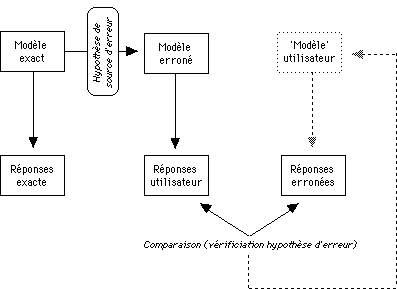 Les travaux sur les modèles de l'utilisateur ont surtout été réalisés dans le domaine du logiciel éducatif. Dans ce cas, la modélisation de l'apprenant vise le plus souvent à identifier les connaissances incorrectes à partir de ses erreurs. Aussi, le modèle de l'utilisateur porte parfois le nom de 'diagnostic'. Il s'agit alors de déterminer, parmi l'ensemble des connaissances nécessaires, celles dont l'apprenant dispose effectivement et quelles sont les connaissances erronées qui s'y ajoutent. Le modèle de l'apprenant ne concerne généralement pas l'utilisation de l'interface mais les connaissances du domaine, celles que le sujet doit apprendre. Le principe de base consiste à décrire les connaissances du sujet par rapport aux connaissances d'un expert, considérées comme correctes et complètes. Construire un modèle de l'élève consiste à rechercher des connaissances erronées ou manquantes qui expliquent la différence entre le comportement d'un expert et de l'élève.