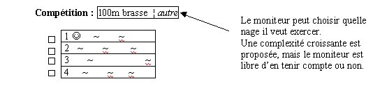 Nous allons garder l’ordre de cette démarche pour la suite de notre exemple. De plus, nous avons préféré insérer les arguments tout au long de l’exemple plutôt que les séparer, car la majorité des arguments se rapporte à une étape en particulier. Exemple d’utilisation et arguments Dans le cadre du club de natation, nous avions vu, parmi les besoins cités dans la description, que les moniteurs doivent acquérir des connaissances techniques. En effet, les mouvements précis de chaque nage sont assez compliqués et doivent être bien enseignés, si l’on veut permettre à un nageur d’avancer vite et correctement, c’est-à-dire sans zig-zag. Ces connaissances pourraient bien sûr être mobilisées et apprises de manière différente, plus traditionnelle, mais souvent les « entreprises » aiment avoir des supports pour leurs apprenants. En effet, Jean-Paul Coste dit que "de nombreuses institutions s’intéressent actuellement au développement de formations 'en ligne' ". Cette formation "on line" laisse entre autres la possibilité à celui qui apprend de se former au moment le plus favorable pour lui. Il est toutefois important de souligner que les apprenants devraient connaître déjà un peu le sujet avant (De Jong & Van Joolingen, 1998, p. 187) de se lancer dans la simulation, sinon, les hypothèses formulées n’auront aucun sens. Mais cela semble aller de soi, puisque le logiciel est prévu pour des moniteurs de natation qui évidemment savent eux-mêmes déjà nager. Ces deux arguments sont valables pour tout environnement d’apprentissage informatique. Il faut toutefois préciser que les connaissances préalables ne dont pas toujours un pré requis obligatoire pour entrer dans un logiciel, elles sont une aide pour la progression à l’intérieur de ce dernier. Nous pensons qu’il serait possible de créer une simulation, où l’apprenant doit créer un modèle de nage (la brasse par exemple), à partir de certaines variables. La simulation se présente de la manière suivante : il y a un bassin virtuel, avec 4 nageurs prêts à la compétition. Un des nageurs est celui du moniteur J ; les autres sont dirigés par l’ordinateur. 1) La question posée par la simulation est :